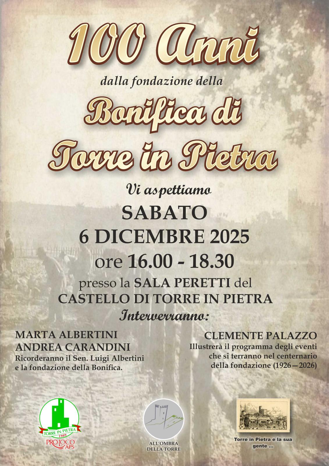 Sabato 6 dicembre dalla 16.00 alle 18.30 appuntamento presso la Sala dei Prefetti del Castello di Torre in Pietra in occasione dei “100 anni dalla fondazione della Bonifica di Torre in Pietra”.