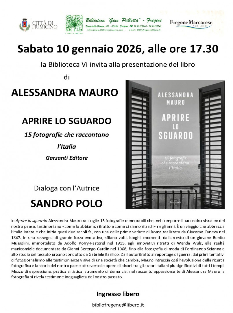 Sabato 10 gennaio alle 17.30 alla Biblioteca “Gino Pallotta” (Viale della Pineta, 140 – Fregene) appuntamento con la presentazione del libro di Alessandra Mauro dal titolo “Aprire lo sguardo – 15 fotografie che raccontano l’Italia” (Garzanti editore). Dialoga con l’autore, Sandro Polo. Ingresso libero.