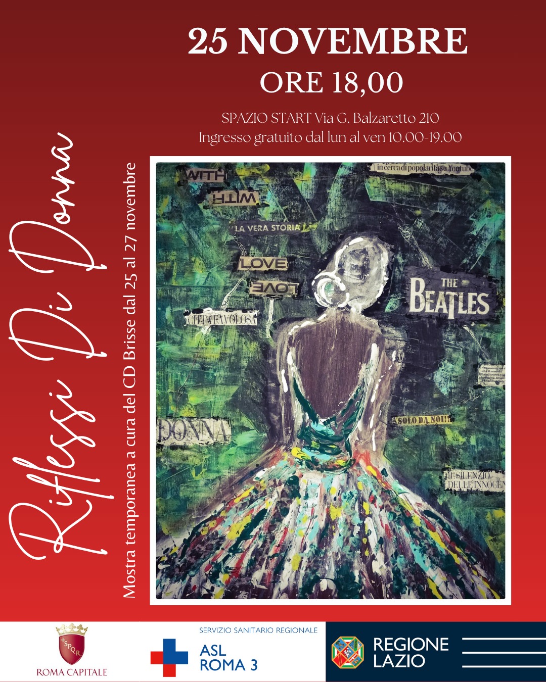 In occasione della Giornata internazionale per l’eliminazione della violenza contro le donne il Centro Diurno Brisse della Asl Roma 3 inaugura martedì 25 novembre, alle ore 18, una mostra dal titolo ‘Riflessi di Donna’. L’esposizione si terrà presso lo Spazio Start (Via Balzaretto, 210 – Roma) gestito dal critico d’arte Daniele Radini Tedeschi e da Stefania Pieralice.