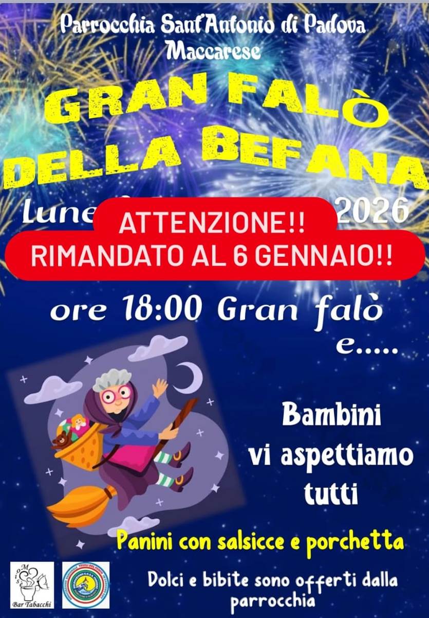 Sempre a Maccarese alla chiesa di Sant’Antonio in viale di Porto il 6 gennaio alle 18.00 in programma il “Rogo della Vecia o Gran Falò della Befana”, una tradizione consolidata della comunità locale. La Parrocchia offrirà le bevande, panini con porchetta e salsicce a pagamento, ingresso libero.