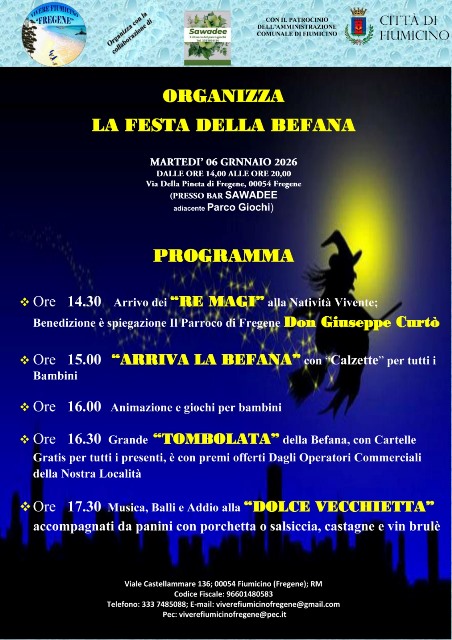 L’associazione Vivere Fiumicino Fregene propone sempre il 6 gennaio dalle 14.30 alle 20.00 in viale della Pineta, presso il bar Sawadee accanto al Parco giochi, la Festa della Befana. Questo il programma: alle 14.30 l’arrivo dei Re Magi con benedizione di Don Giuseppe Curtò, parroco di Fregene. Alle 15.00 l’Arrivo della Befana con calzette per tutti i bambini; alle 16.00 animazione per i bambini; alle 16.30 la Tombolata con cartelle gratuite e premi a cura degli operatori commerciali di Fregene; dalle 17.30 musica, balli e l’addio alla Dolce Vecchietta, accompagnato da panini con porchetta e salsicce, castagne arrosto e vin brulè. L’iniziativa si svolgerà anche in caso di pioggia.