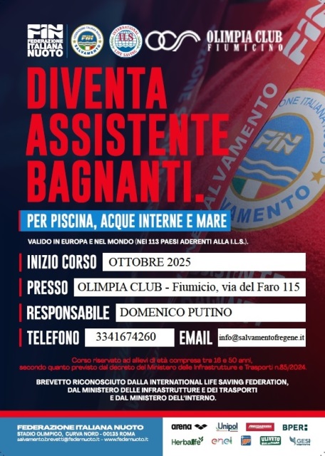 Il nuovo Fiduciario FIN è già operativo sul territorio con nuove attività formative: è infatti in partenza un ciclo di corsi per Assistenti Bagnanti a Fiumicino, che si terranno presso l’Olimpia Club, in via del Faro 115. La presentazione ufficiale del corso è fissata per giovedì 10 ottobre 2025 alle 20.00, e sarà un’occasione aperta al pubblico per conoscere le modalità di iscrizione, il programma didattico e le opportunità professionali legate alla figura dell’assistente bagnanti.