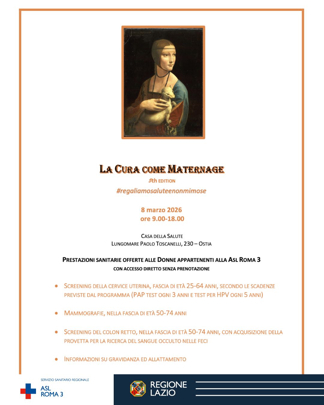 “Anche quest’anno – conclude Maria Rita Noviello, Dirigente Responsabile degli Screening Oncologici Asl Roma 3 – la Asl Roma 3 trasforma la Festa della Donna da sterile celebrazione in servizio sanitario, offrendo test di screening gratuiti e senza prenotazione. ‘La cura come maternage’ intende così ribadire l’importanza di prendersi cura della propria Salute grazie alla Prevenzione, che resta lo strumento sanitario più potente ed efficace che abbiamo a disposizione per stare bene”.
