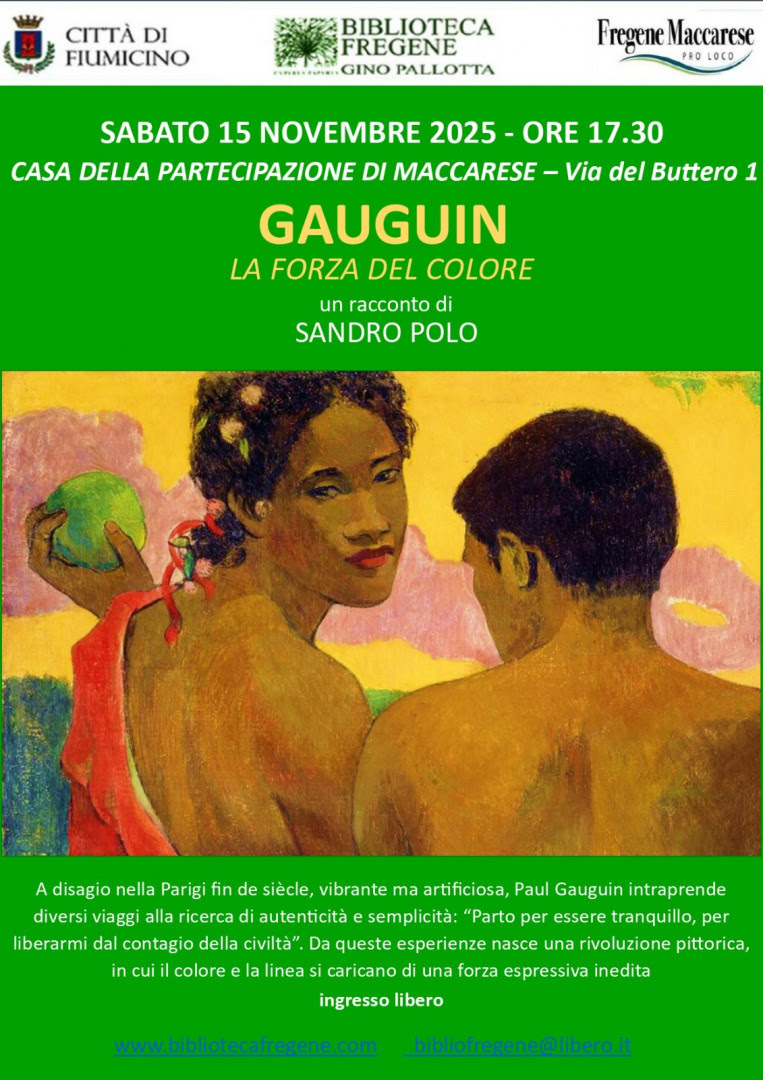 Sabato 15 novembre, ore 17.30 presso la Casa della Partecipazione (via del Buttero – Maccarese) appuntamento con la conferenza di Sandro Polo: “Gauguin, la forza del colore”.