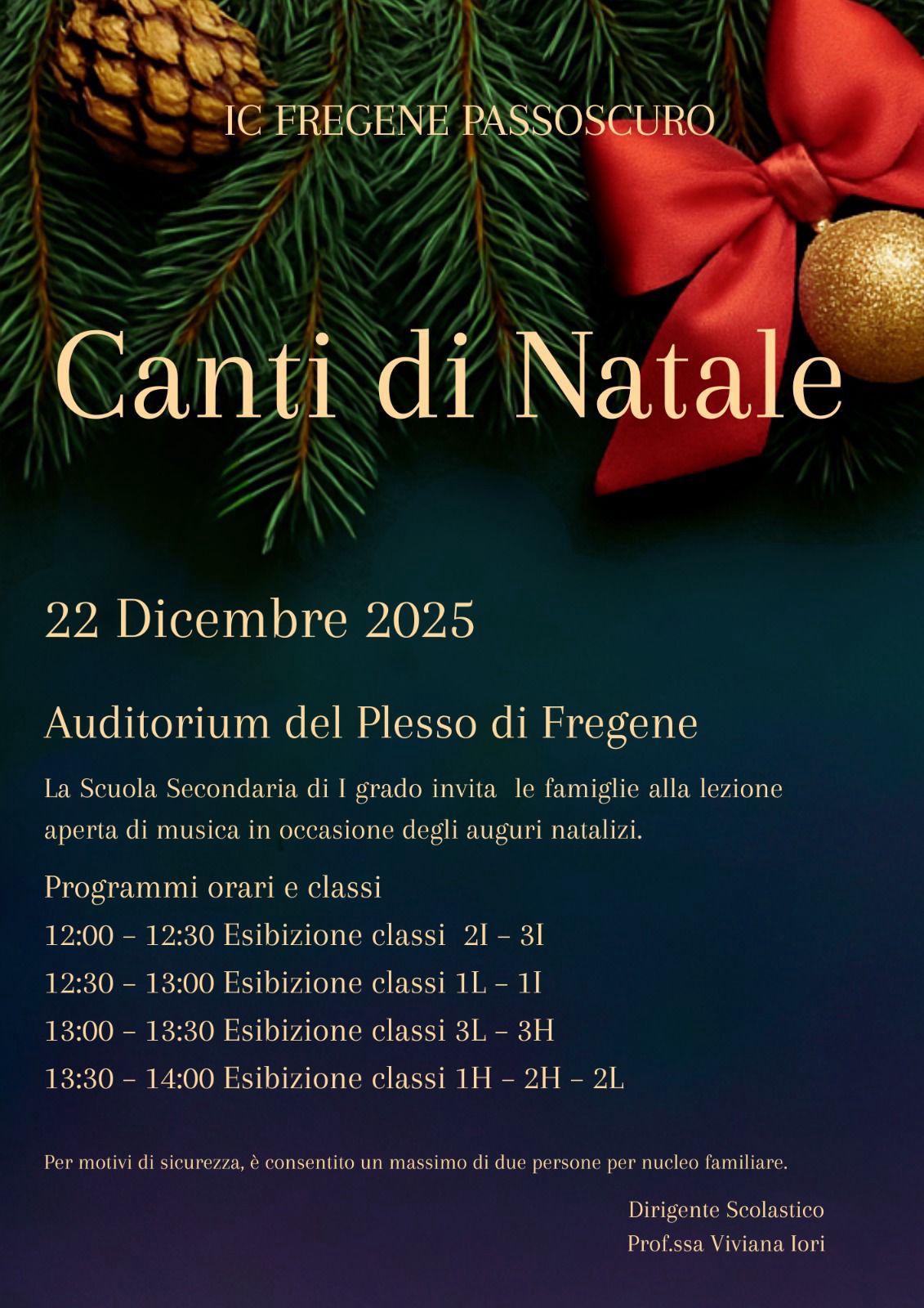 L’Istituto Comprensivo “Fregene Passoscuro” si prepara a celebrare le festività natalizie con un evento speciale dedicato alla musica. Lunedì 22 dicembre, l’Auditorium del Plesso di Fregene ospiterà i “Canti di Natale”, che vedrà protagonisti gli studenti della Scuola Secondaria di I grado.