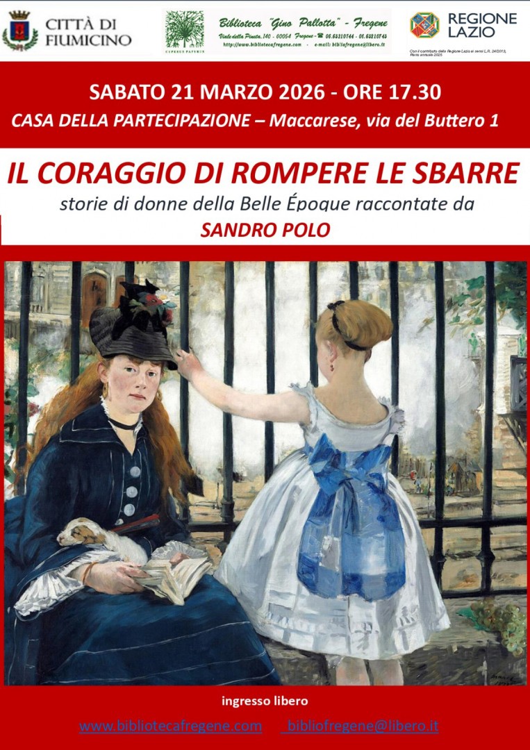 “Il coraggio di rompere le sbarre: storie di donne della Belle Époque” sarà il tema dell’incontro con lo storico dell’arte Sandro Polo, organizzato dalla Biblioteca “Gino Pallotta”, in programma sabato 21 marzo 2026 alle ore 17.30 presso la Casa della Partecipazione a Maccarese (via del Buttero, 1) .