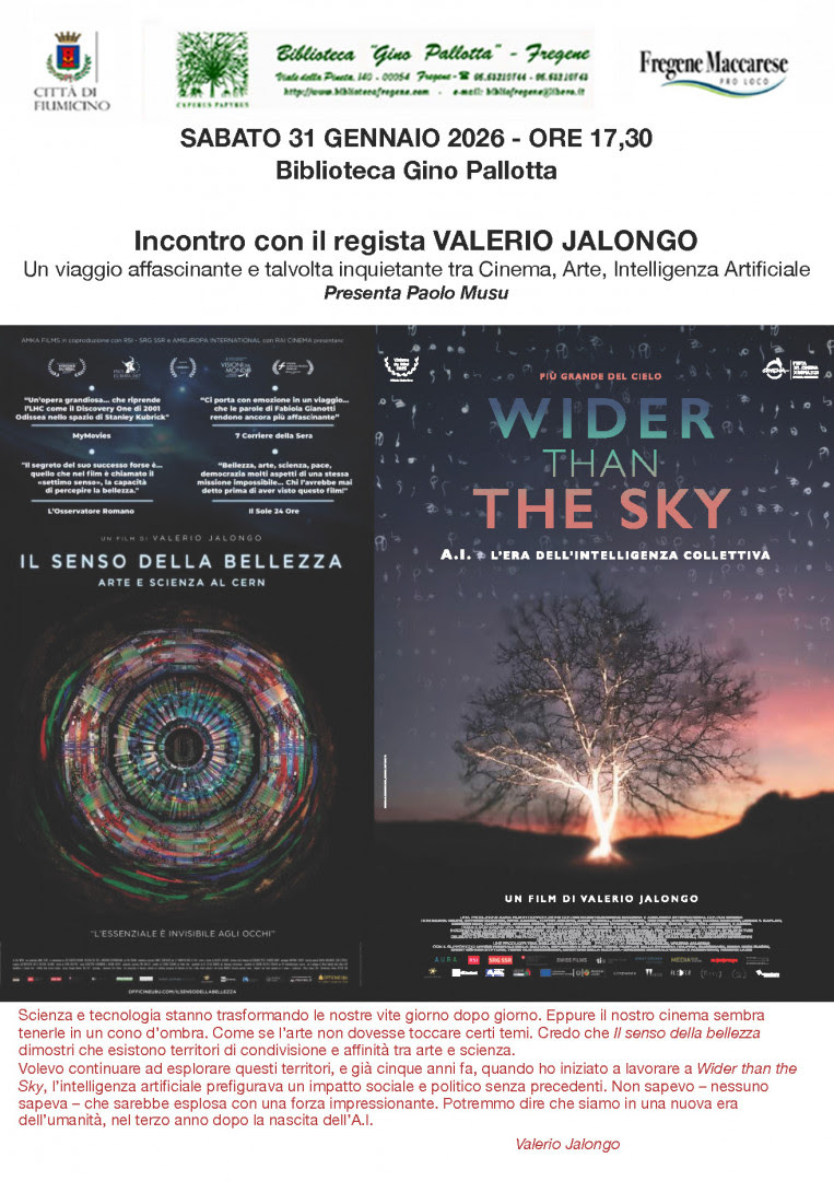 Cinema, Arte, Intelligenza Artificiale. Sabato 31 gennaio  alle ore 17.30 alla Biblioteca Pallotta (viale della Pineta, 140 – Fregene) incontro con il regista Valerio Jalongo. A cura di Paolo Musu.