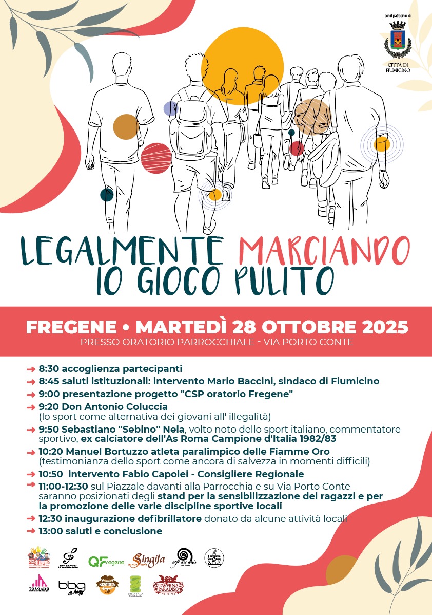 Martedì 28 ottobre appuntamento con “Legalmente Marciando – Io gioco pulito”. L’iniziativa si svolgerà a Fregene presso l’Oratorio Parrocchiale e in via Porto Conte. L’evento inizierà alle ore 8.30 e si concluderà alle ore 13.00, articolandosi in tre momenti principali.