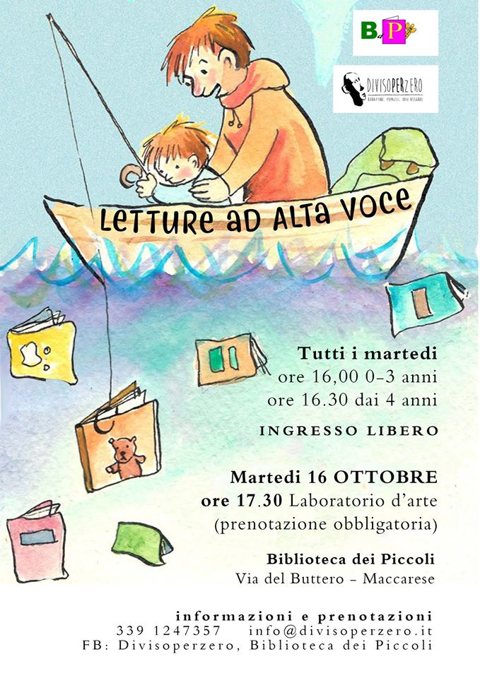 Da martedì 16 ottobre riprendono le letture ad alta voce a cura di Divisoperzero presso la Biblioteca dei Piccoli a Maccarese. Gli incontri saranno sempre di martedì e da quest’anno saranno divisi in due fasce orarie: dalle 16.00, per una mezz’oretta,verranno letti libri adatti ai piccoli da 0 a 3 anni; poi dalle 16.30 spazio ai bambini dai 4 anni in su. Si festeggerà l’inizio delle letture traendo ispirazione da uno dei libri preferiti di Divisoperzero per sporcarsi le mani con un bellissimo laboratorio di arte. L’ingresso per le letture è sempre gratuito, per il laboratorio è previsto un contributo di 7 euro e la prenotazione è obbligatoria.
