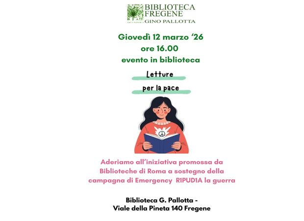 La Biblioteca Gino Pallotta (viale della Pineta, 140 – Fregene)  aderisce alla “Maratona di Letture per la Pace”, un evento coordinato dalle Biblioteche del Comune di Roma. L’appuntamento è fissato per giovedì 12 marzo, con inizio alle ore 16.00.