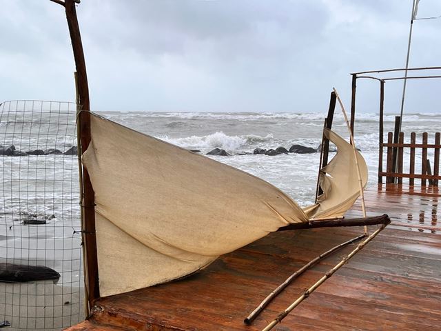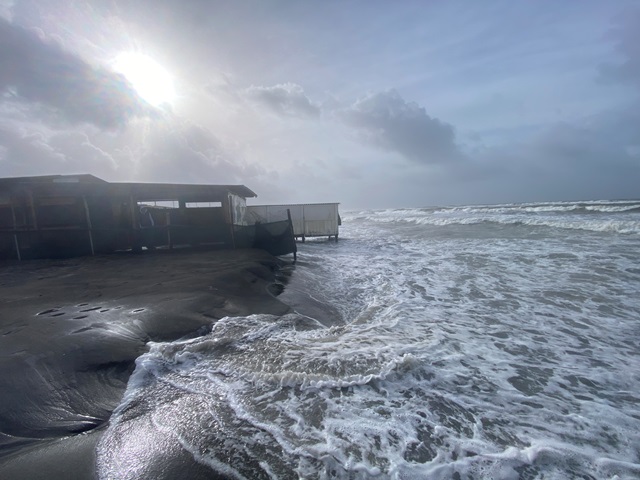 Qualcuno ha dormito dentro stanotte, cercando di rafforzare il più possibile le difese, specialmente barriere di sabbia o tavola di legno inchiodate dove possibile. Al Manila già alle 7.30 la situazione era diventata difficile, la sabbia accumulata davanti al ristorante era quasi sparita. A un certo punto il vento è calato, le onde si sono alzate e si è temuto il peggio. Ora il mare è proprio sotto alla vetrata e si spera che la struttura riesca a resistere.