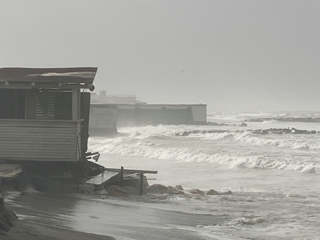 Nell fascia protetta dalla soffolta, la situazione sembra più sotto controllo, anche se il livello del mare molto più alto del solito, ha fatto arrivare le onde di nuovo sotto alle strutture degli stabilimenti, vetrate, palizzate, immagini di ritorno dal passato. Nelle prime ore del pomeriggio è previsto un abbassamento del livello della marea, quindi il pericolo dovrebbe essere scampato, almeno si spera.