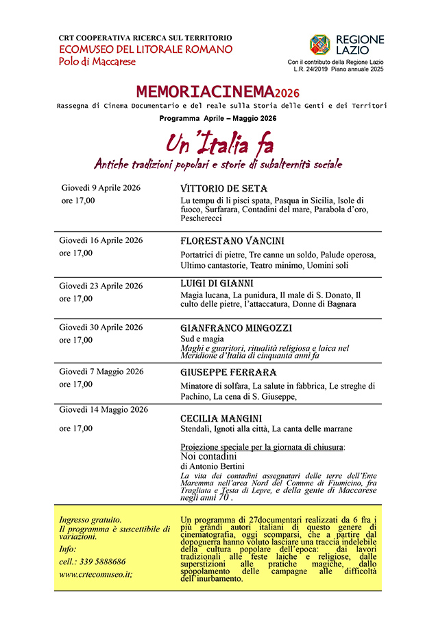 Un viaggio nella memoria collettiva del Paese, tra tradizioni popolari, lavoro e identità. Parte al Polo di Maccarese dell’Ecomuseo del Litorale Romano la rassegna “Memoriacinema 2026”, ciclo di proiezioni e incontri dedicato al cinema documentario e del reale che, tra aprile e maggio, accompagnerà il pubblico in un percorso intenso dentro la storia delle genti e dei territori. L’iniziativa, promossa dalla Cooperativa Ricerca sul Territorio (CRT), si svolgerà nella Sala Visioni del Castello San Giorgio, con ingresso gratuito. Tutti gli appuntamenti sono in programma alle ore 17.00.