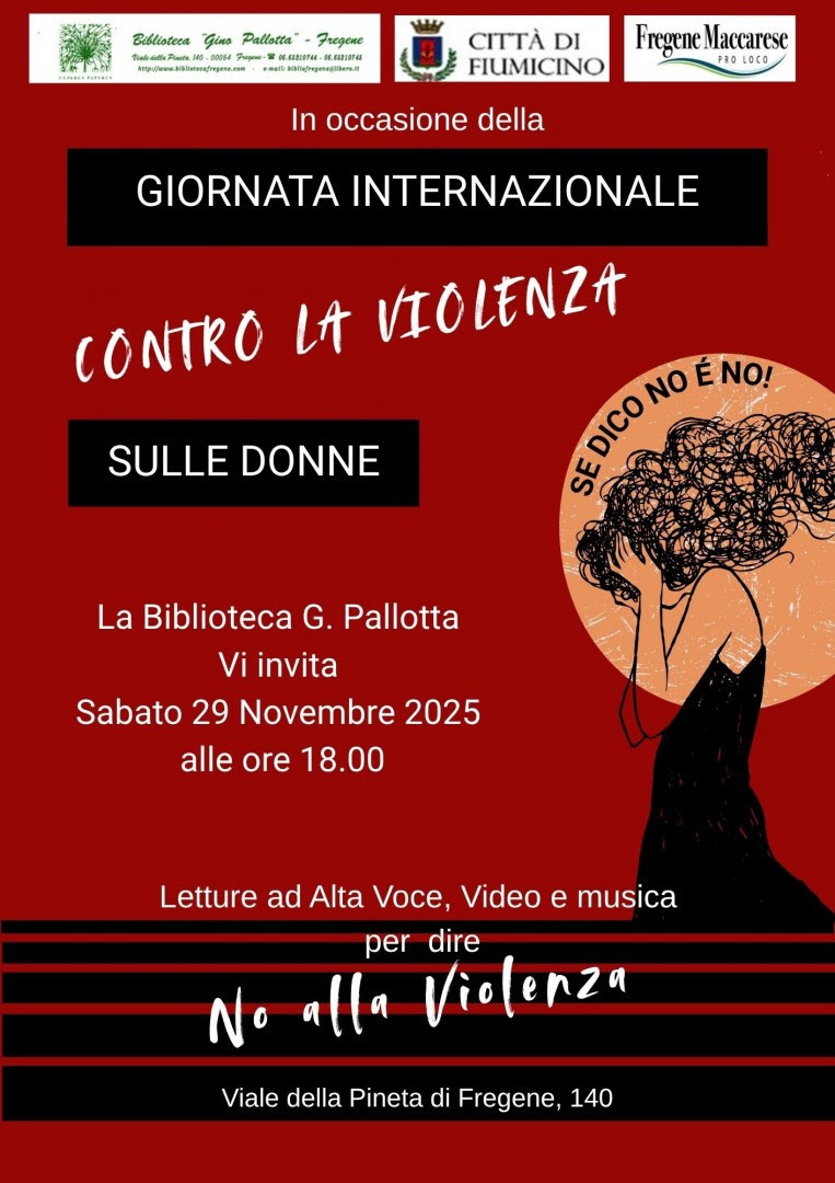 La Biblioteca “Gino Pallotta” (viale della Pineta, 140 – Fregene) invita sabato 29 novembre alle ore 18.00 a letture ad alta voce, video e musica per dire “No alla violenza sulle donne”.