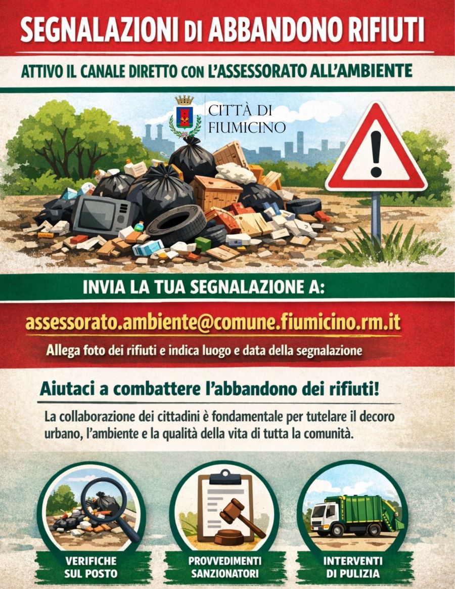 Il Comune di Fiumicino informa i cittadini che è attivo un canale diretto per la segnalazione di episodi di abbandono illecito di rifiuti sul territorio.