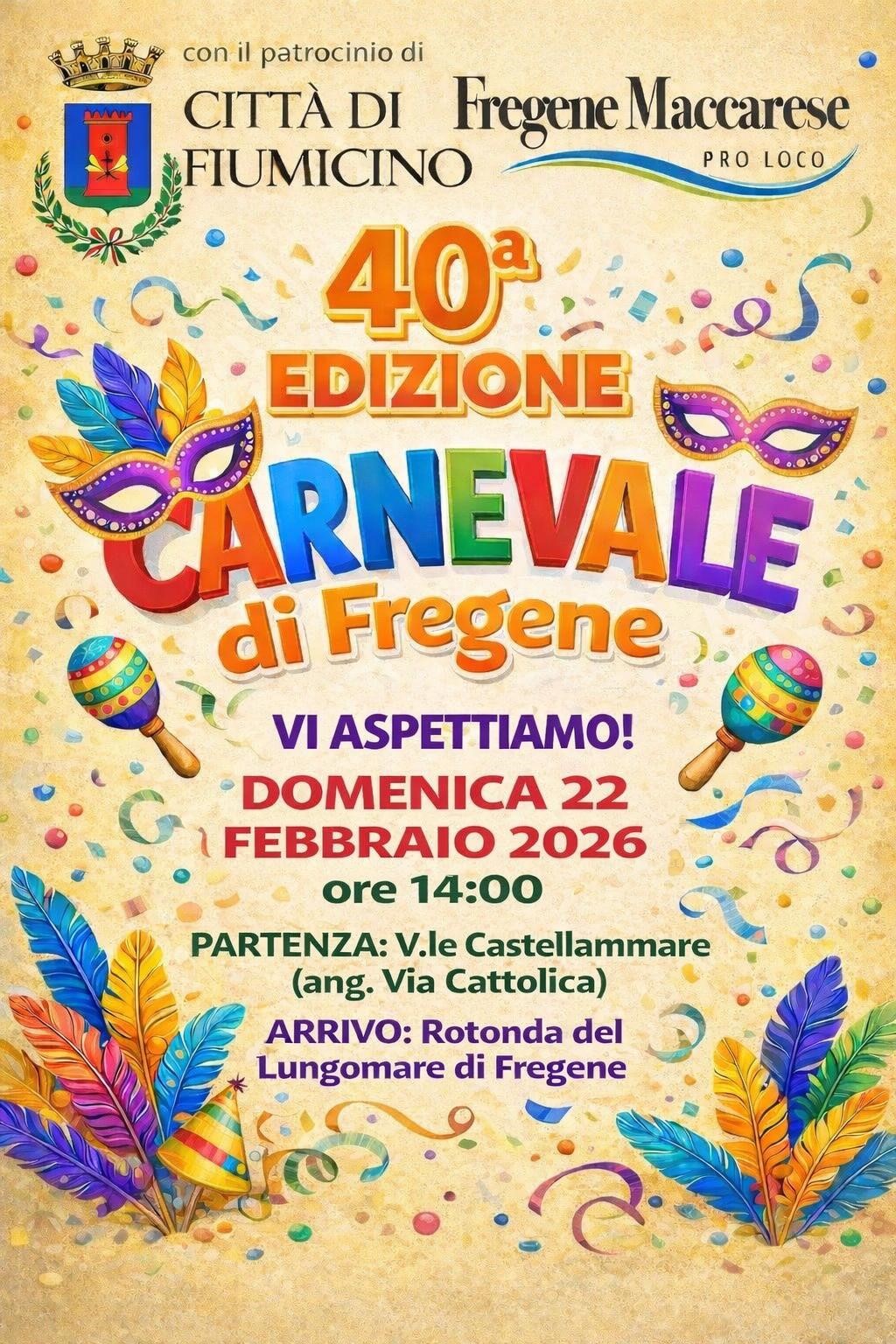 Con il patrocinio della Città di Fiumicino e l’organizzazione della Pro Loco Fregene Maccarese, domenica 22 febbraio 2026 torna uno degli appuntamenti più attesi del litorale romano: la 40ª edizione del Carnevale di Fregene.
