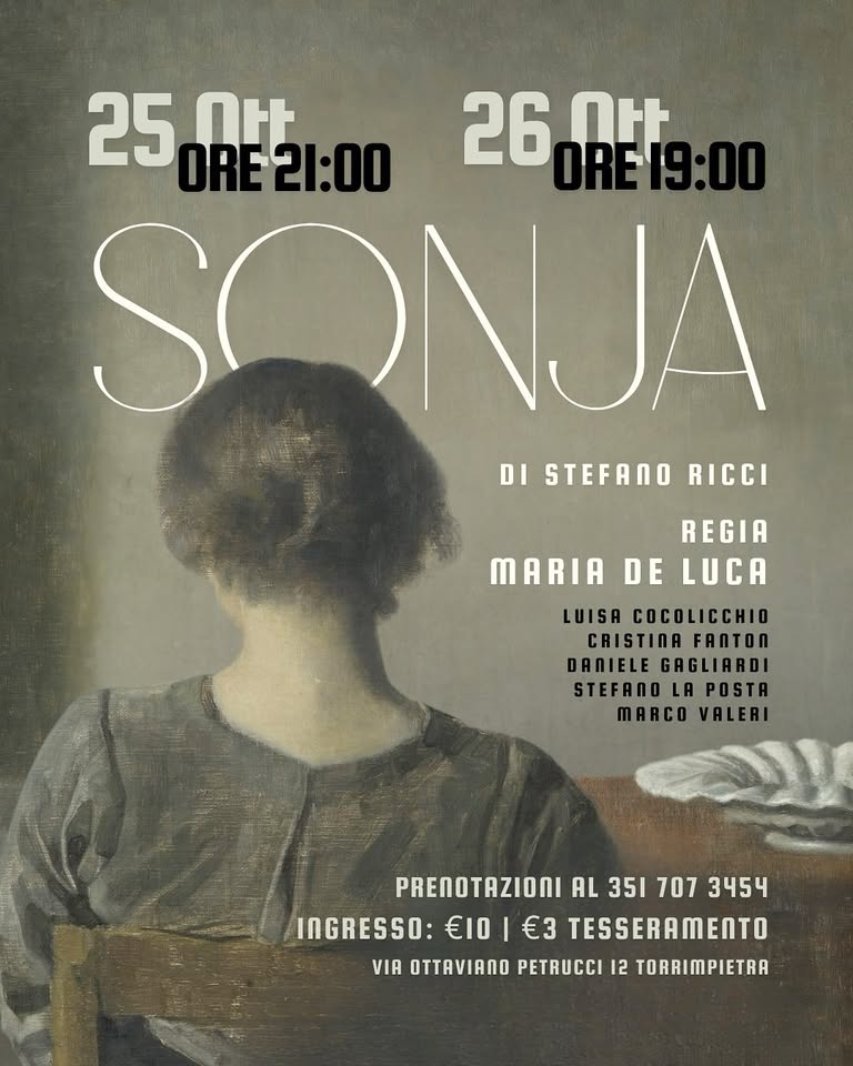 Sabato 25 ottobre alle ore 21.00 e domenica 26 ottobre ore 19:00, presso lo Spazio Artistico – Traccedarte si terrà lo spettacolo “Sonja” di Stefano Ricci, regia di Maria De Luca.