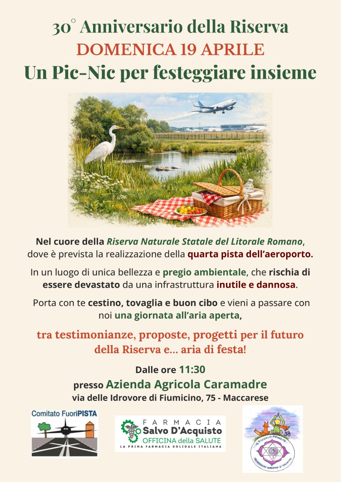 Il Comitato FuoriPista, la Farmacia Solidale Salvo D’Acquisto e Yogarmonia Walking e Treking e invitano tutti coloro che hanno a cuore la Riserva e intendono impegnarsi per la sua integrità – contro progetti di deperimetrazioni, di quarte piste e quant’altro – a passare insieme la giornata di domenica 19 aprile presso l’Azienda Agricola Caramadre in via delle Idrovore 75 a Maccarese dalle 11,30 in poi.