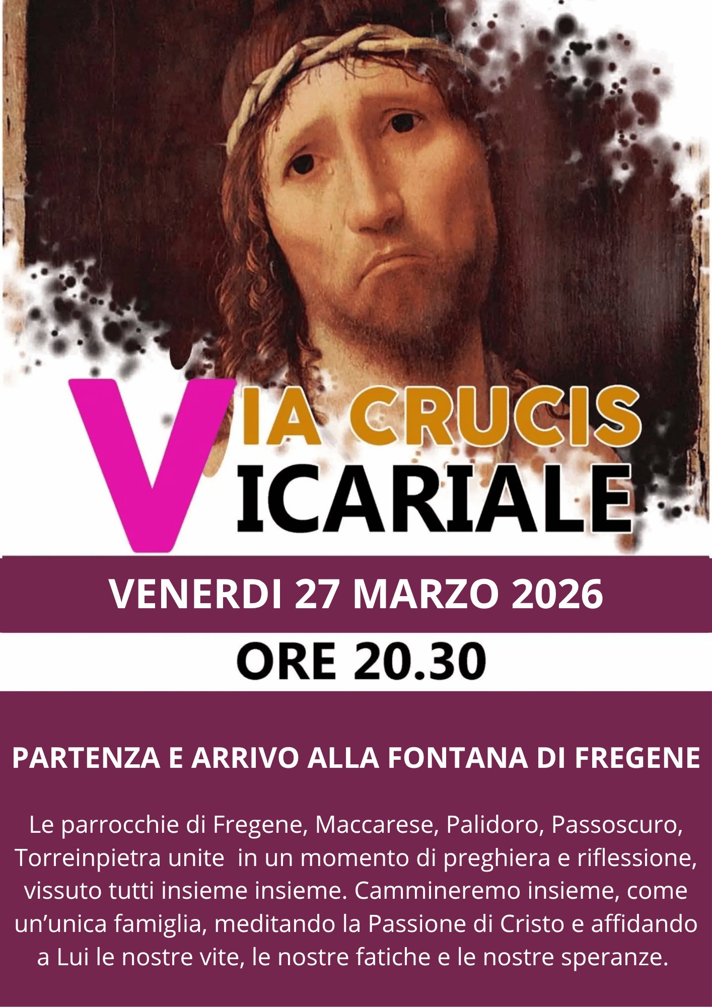 Le parrocchie di Fregene, Maccarese, Palidoro, Passoscuro e Torrimpietra si uniscono in un unico cammino di fede. Un momento forte di preghiera, di silenzio e di condivisione, per accompagnare Gesù nel suo cammino verso la Croce e riscoprirci comunità unite.