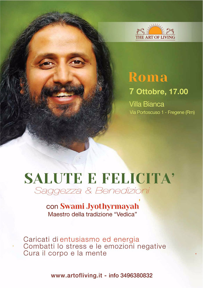 Il 7 ottobre a Villa Bianca (via Portoscuso, 1) si terrà l’evento “Salute e Felicità – Saggezza e benedizioni”, con il Maestro della tradizione Vedica Swami Jyothyrmayah. Una occasione per caricarsi di entusiasmo ed energia, combattere lo stress e le emozioni negative, curare il corpo e la mente.