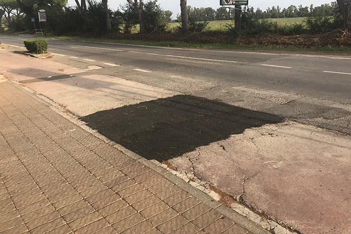 Avevamo segnalato già diversi mesi fa lo stato indecoroso della pista ciclabile di viale Castel San Giorgio a Maccarese, diversi lettori avevano scritto e inviato appelli per scongiurare che qualcuno si facesse male cadendo. Finalmente qualche giorno fa la pericolosa buca che si era aperta proprio di fronte all’ingresso del caseggiato di Borgo San Giorgio è stata rattoppata. Niente a che vedere con il fondo originale della pista ciclabile, in quanto la toppa è stata messa in asfalto, ma meglio di rischiare cadute per ciclisti e pedoni… ci si accontenta. In generale lo stato della ciclabile di Maccarese non è ottimale, il fondo è “crepato” in vari punti, la segnaletica a terra è sparita e andrebbero posizionati dei cestini per i rifiuti.