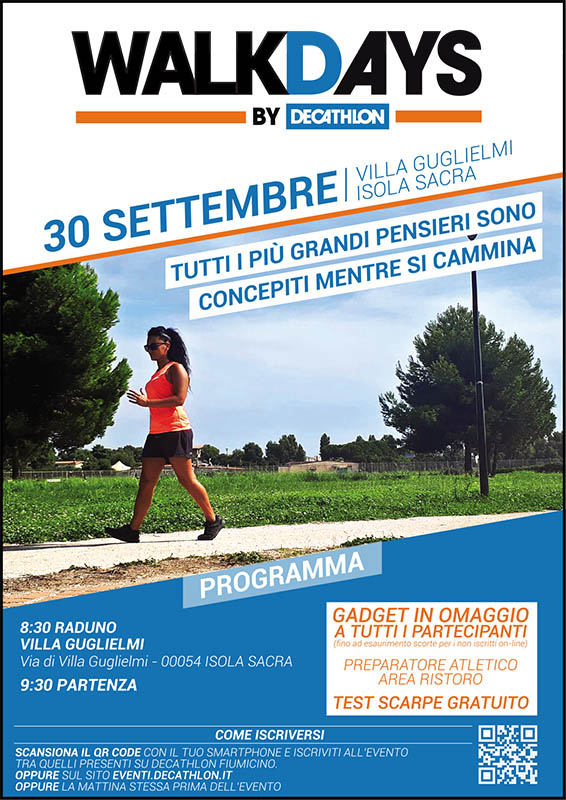 Si terrà domenica 30 settembre presso Villa Guglielmi a Fiumicino l’iniziativa di Decathlon dedicata agli amanti della camminata sportiva. Walkdays infatti sbarca anche anche nel nostro comune e propone una passeggiata all’interno del noto parco all’interno di Fiumicino.