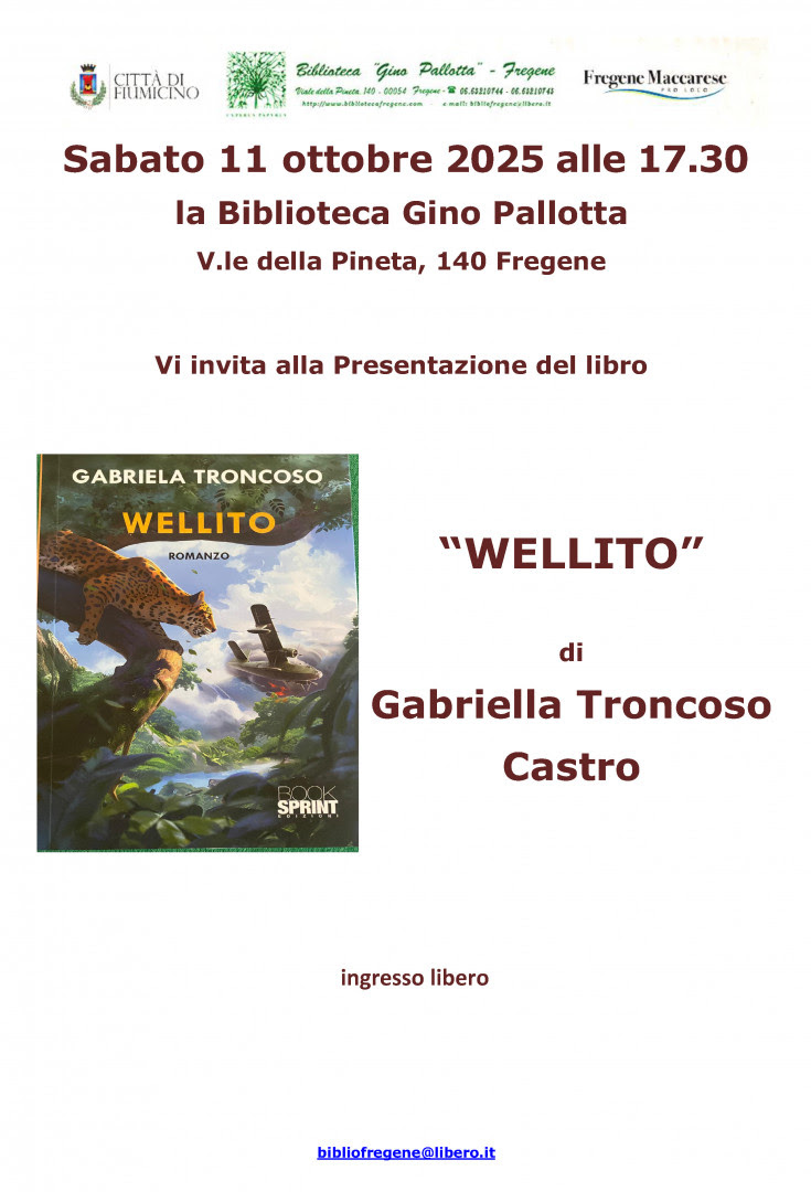 Sabato 11 ottobre alle 17.30 alla Biblioteca “Gino Pallotta” (viale della Pineta, 140 – Fregene) appuntamento con la presentazione del libro “Wellito” di Gabriella Troncoso Castro.